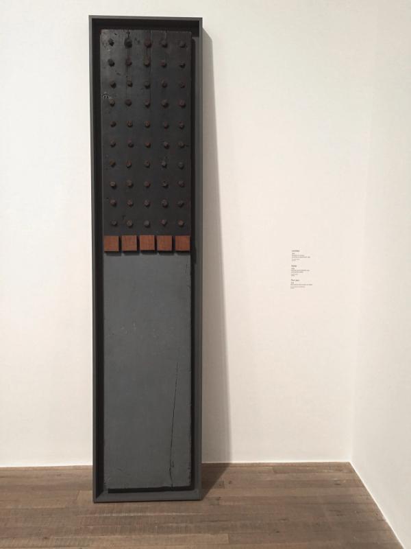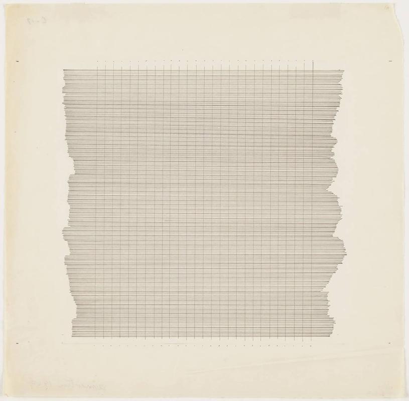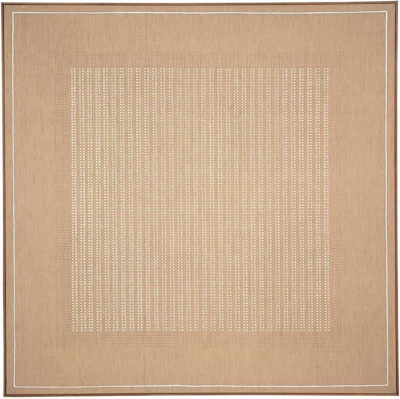 Agnes Martin's exploration of grid formats began to take shape in the late 1950s and early 1960s, marking a significant transition in her artistic approach. "The Laws" (1958), one of her early forays into the grid structure, utilized boat spikes nailed into wood, presenting a rudimentary grid that hints at her future direction. This piece reflects her initial experiments with grids, showing her move away from more expressive forms towards a controlled, geometric order that would define her later works (Art Canada Institute).
