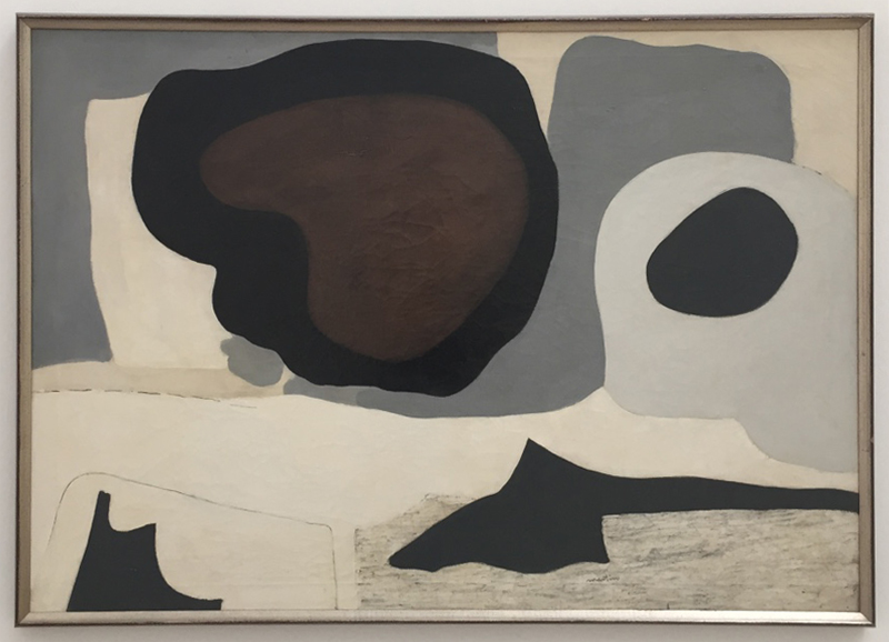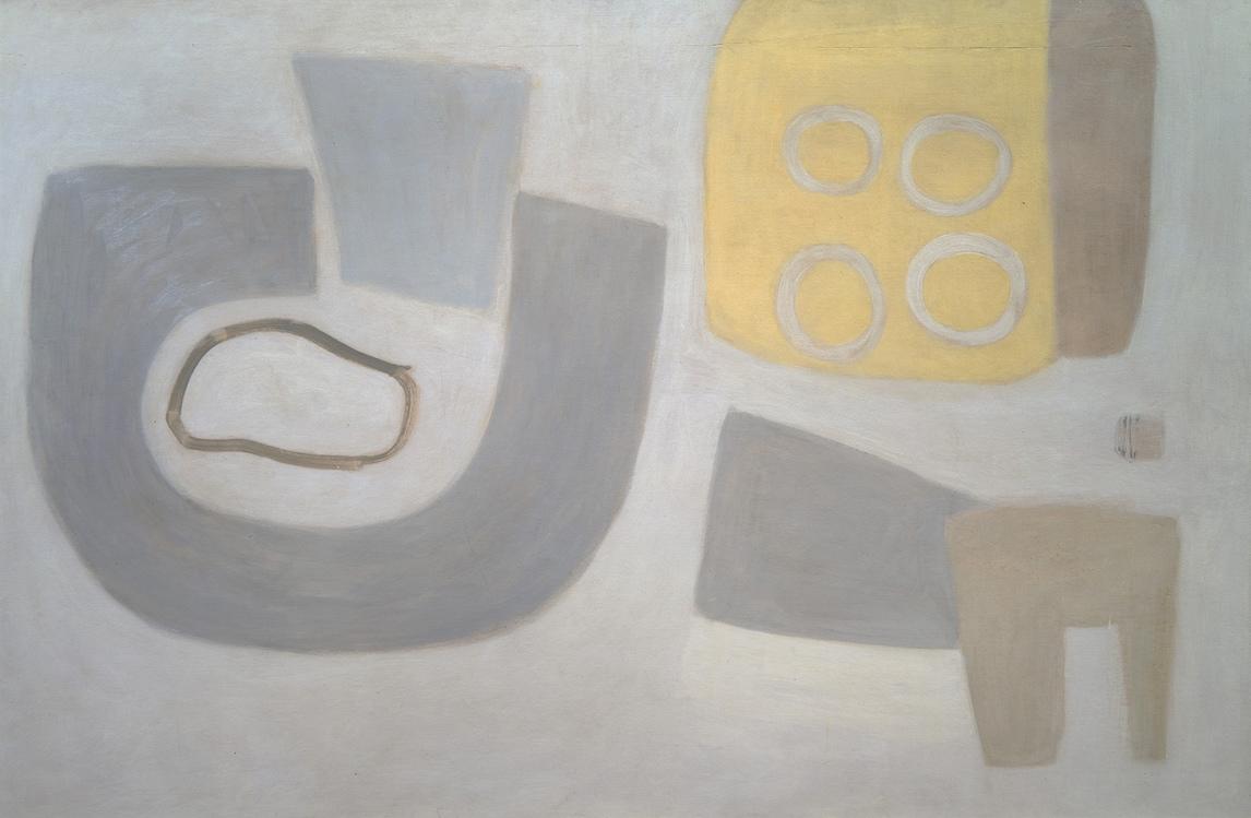 During this time, one of Martin's key works, Untitled (c. 1955), exemplifies this biomorphic approach. The painting features contrasting organic forms that float over a pale background, reflecting influences from Arshile Gorky, whose work Martin likely encountered in New York. This style is evident in Martin's incorporation of free-floating, surreal lines seen in her earlier works, such as in "The Expulsion of Adam and Eve from the Garden of Eden" (c. 1953). The star-like feature in "Untitled" is reminiscent of the abstract, free-form lines in "The Expulsion," showcasing her transition from more literal representations to exploring formlessness (Wikipedia).