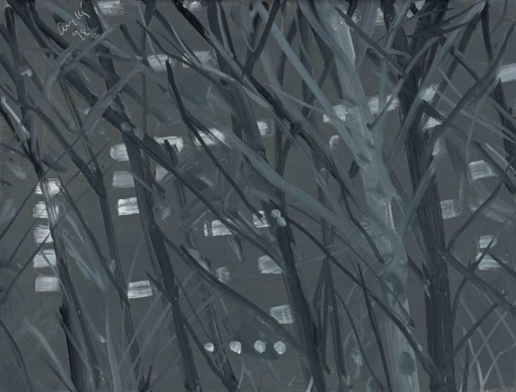Alex Katz's Night Paintings series, developed primarily in the 1980s and 1990s, represents a significant departure from his more colorful daytime scenes, engaging deeply with themes of darkness, isolation, and the subtle interplay of light and shadow. These works stand in contrast to his earlier, more vibrant compositions, exploring almost monochrome landscapes that are punctuated only by fleeting moments of illumination. Katz's night paintings veer close to abstraction, reminiscent of Color Field paintings, yet they retain hints of realism through details like leaf patterns, rock formations, or the reflections of moonlight. This duality invites viewers into a contemplative space where the boundary between the real and the abstract becomes blurred (TheCollector).