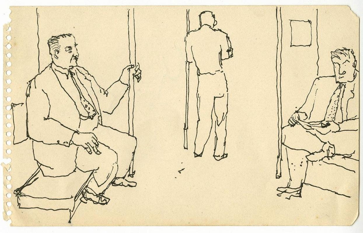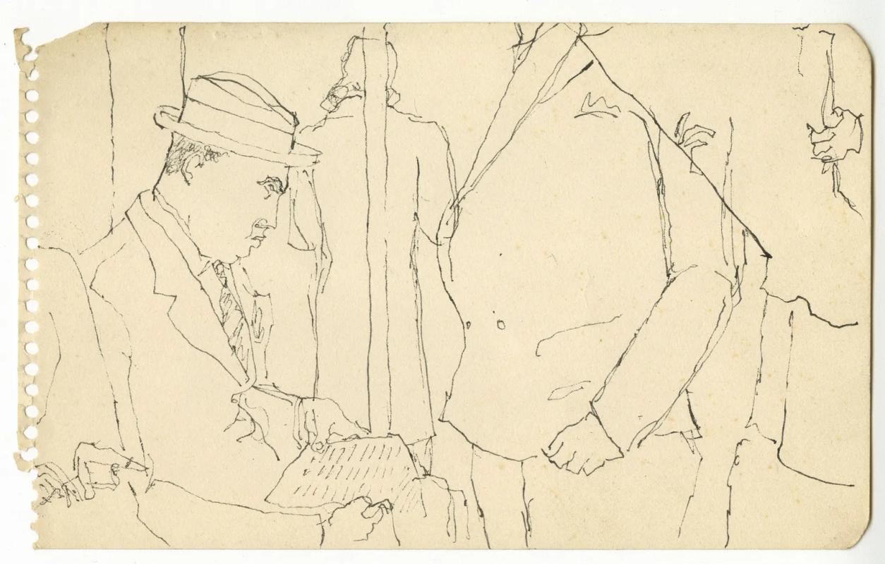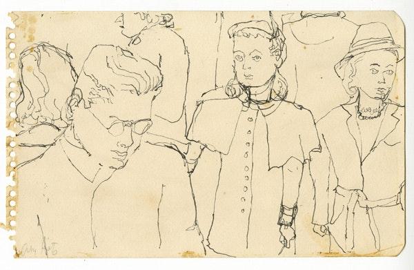 Alex Katz's Subway Drawings series, emerging from his time as a student in the 1940s, captures the essence of New York's subway passengers with a unique blend of immediacy and introspection. These sketches, often made during Katz's subway rides into the early hours, served as a dynamic classroom where Katz could study figures in a more spontaneous, real-world context compared to the posed models of the art school studio. The drawings are characterized by their sparse line work, capturing fleeting moments and the solitude of passengers lost in contemplation, surrounded by the empty space of the subway car. This approach reflects Katz's early exploration of capturing "the present tense" through art, a theme that has persisted throughout his career.