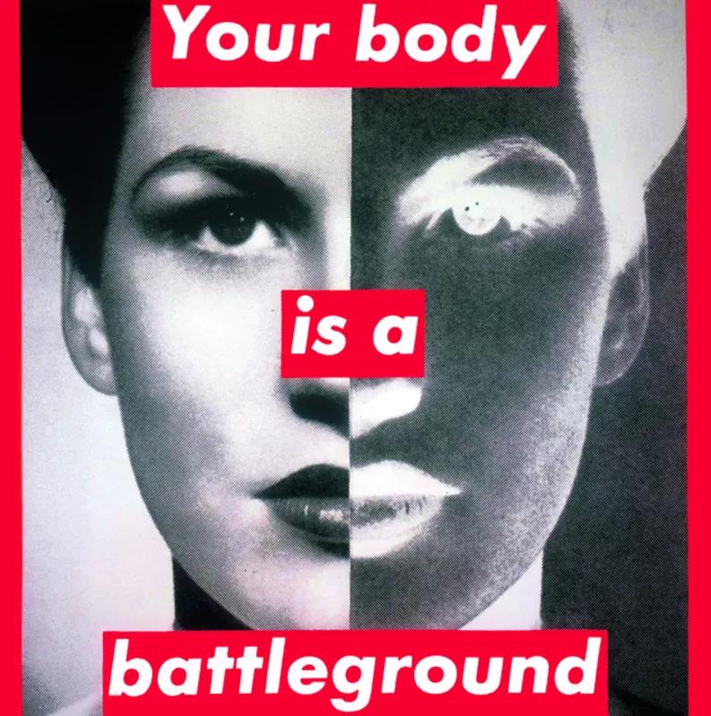 Barbara Kruger's works created through photographic silkscreen on vinyl are some of her most recognized and impactful pieces, blending her background in graphic design with potent, textual messages that critique societal norms and behaviors. "Untitled (Your body is a battleground)," created in 1989, is a prime example of this technique, produced for the Women’s March on Washington to support reproductive freedom. This piece exemplifies how Kruger uses the combination of image and text to create powerful societal commentary. The work features a woman's face divided in positive and negative exposures, overlaid with the titular phrase, signifying the ongoing struggle for women's rights and autonomy. The visual tension in the artwork mirrors the societal and political tensions surrounding the issue of abortion and women's bodily autonomy (The Broad).