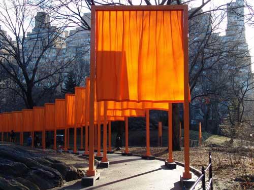 The installation process began in early 2005, with the construction of the gates starting in January. Each gate was 16 feet tall and varied in width from 5 to 18 feet, with the fabric hanging down to approximately 7 feet above the ground. The gates were placed along 23 miles of walkways in Central Park, following the park's natural contours and pathways. The vibrant saffron color was chosen to create a warm and inviting atmosphere during the winter months, contrasting with the bare trees and snowy landscape (The Art Story) (Art in Context).