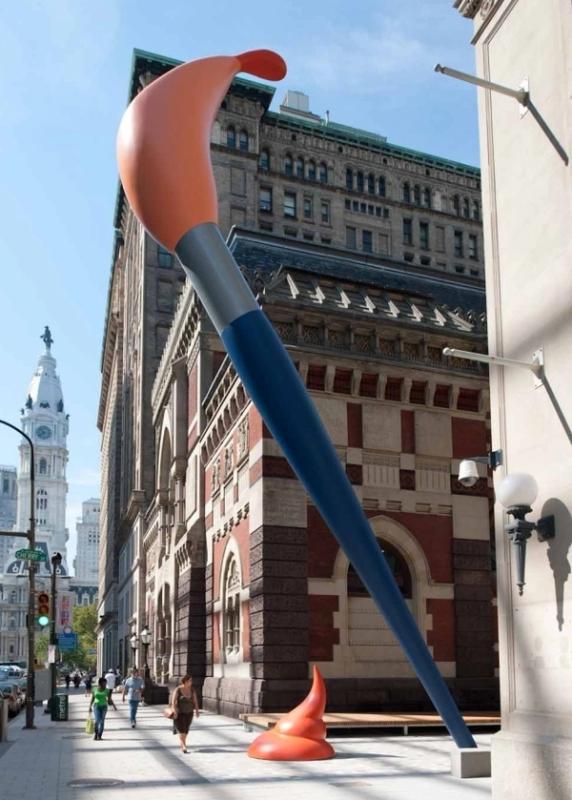 Claes Oldenburg's paint brush sculptures, created in collaboration with Coosje van Bruggen, are notable works that exemplify the duo's ability to transform ordinary objects into monumental art pieces. One of the most famous of these is "Paint Torch," installed in 2011 outside the Pennsylvania Academy of the Fine Arts (PAFA) in Philadelphia. This 60-foot-tall sculpture features a giant paintbrush held aloft, with a "blob" of paint splashed on the ground below. Constructed from stainless steel and aluminum and painted with bright, vivid colors, "Paint Torch" embodies Oldenburg and van Bruggen's characteristic blend of whimsy, scale, and everyday subject matter.
