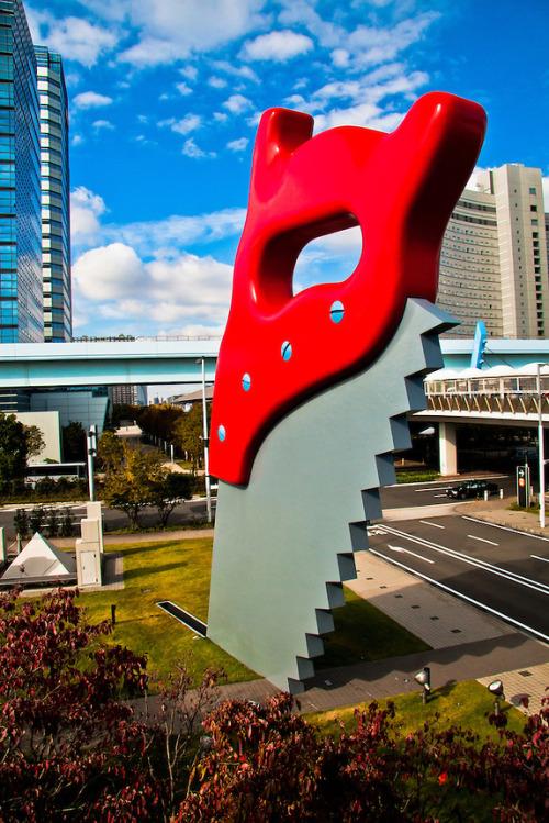 The sculpture's theme and form play on Oldenburg's signature style of enlarging everyday objects to monumental proportions, thereby transforming their meaning and interaction with the surrounding environment. In the case of Saw, Sawing, the saw is depicted as if it were cutting through the earth itself, placed on the north side of the Main Entrance Hall of Tokyo Big Sight. This installation not only serves as an engaging visual landmark but also reflects on the interaction between human-made objects and the natural world, a recurring theme in Oldenburg and van Bruggen's collaborative works. The piece harmonizes with its surroundings while adding a unique, artistic touch to the urban landscape, attracting attention and inviting public engagement with art in a communal space (Smithsonian Institution) (Art@Site).