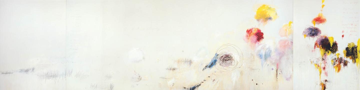 Cy Twombly's Untitled (Say Goodbye, Catullus, to the Shores of Asia Minor) (1994) is a monumental artwork that encapsulates the artist's profound engagement with classical literature, history, and personal narrative through its expansive scale and intricate composition. This piece, created with oil, acrylic, oil stick, crayon, and graphite on three canvases, measures an impressive 157 ½ × 624 inches. It is currently housed in the Menil Collection in Houston, where it stands as a testament to Twombly's unique ability to blend text, image, and abstract expression in a deeply evocative manner (The Menil Collection).