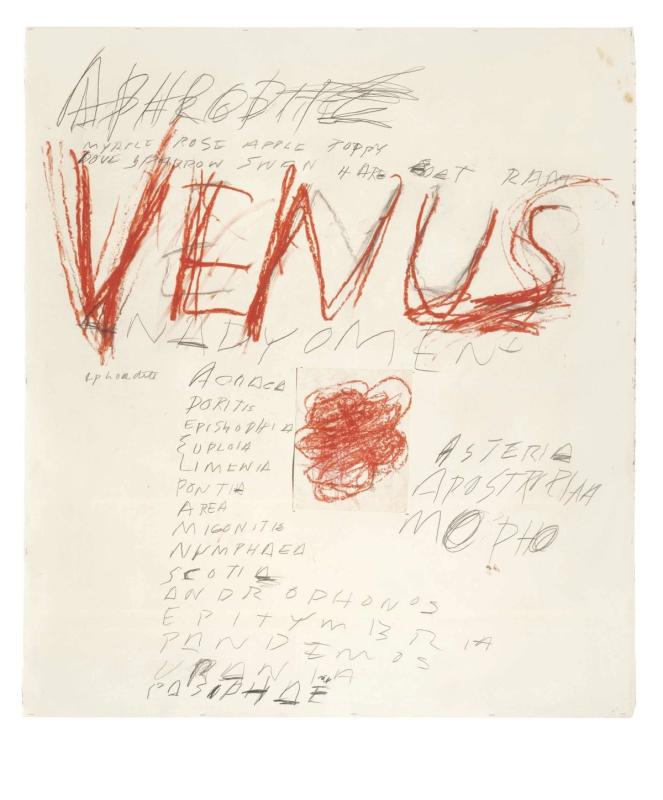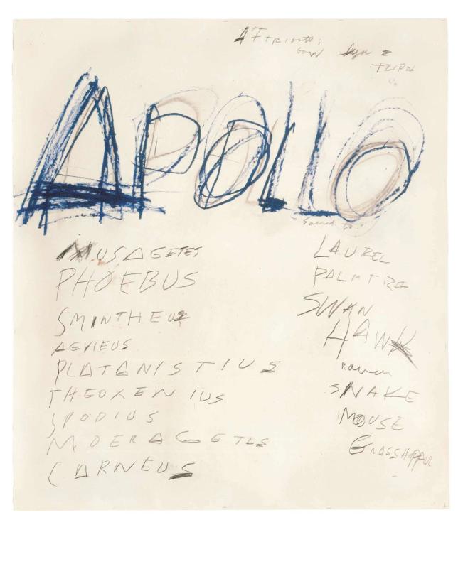 Cy Twombly's "Venus" and "Apollo" from 1975 are part of a body of work that deeply engages with classical antiquity, exploring themes from Greek and Roman mythology through Twombly's distinctive abstract and scribbled forms. These pieces feature the names of the Roman gods scrawled across the canvas, a characteristic method of Twombly to blend textual elements with visual expression, creating a dialogue between the ancient and the contemporary. This approach is emblematic of Twombly's broader interest in the past, particularly the cultures of Greece and Rome, which influenced many of his best-known works (Apollo Magazine).