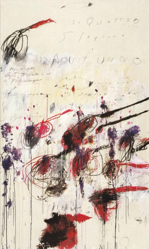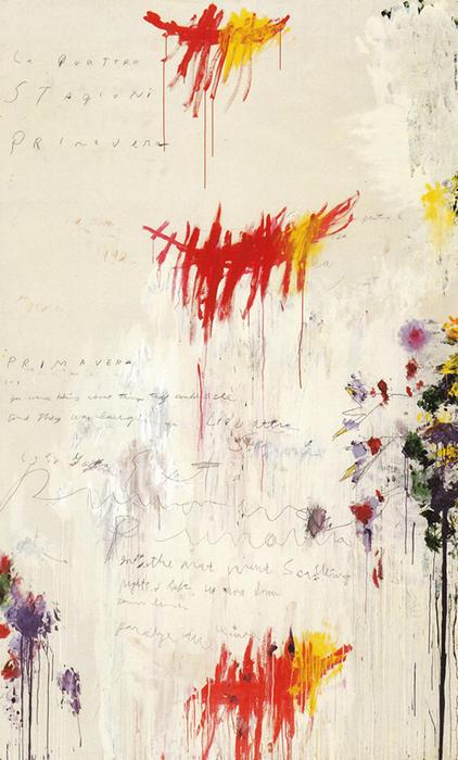 The "Autumn" part, on the other hand, continues this exploration of seasonal change, emphasizing the transformational aspect of nature and perhaps, by extension, the human condition as well. Although specific details about the autumn piece were not extensively described in the available sources, like the rest of the series, it likely features Twombly's use of symbolic colors, gestures, and inscriptions to convey the essence of the season. Twombly's work often includes textual elements, geometric figures, and expressive lines that challenge traditional interpretations of art, making his pieces rich subjects for analysis and reflection (www.wikiart.org).