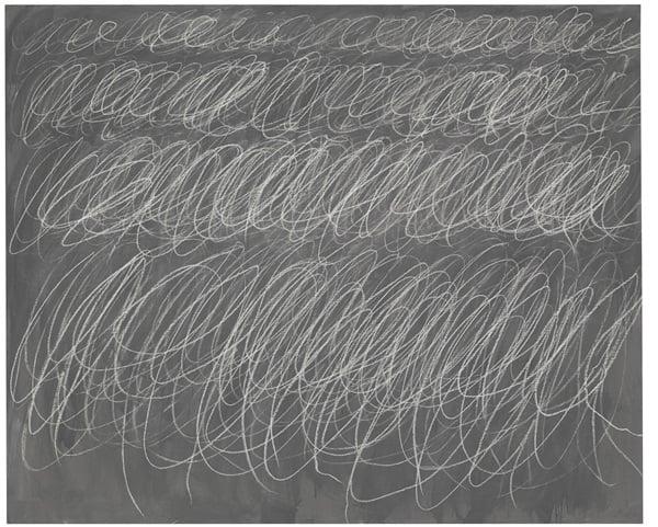 The Blackboard paintings are characterized by their restricted color palette, primarily featuring gray backgrounds with white or light-colored scribbles, which resemble the motions of writing or drawing with chalk. These scribbles, often in the form of continuous, looping lines, create a sense of rhythmic repetition and movement across the canvas. The series was named by art critic Robert Pincus-Witten in 1968, who saw in Twombly's work a revival of the artist’s career through the elimination of extraneous literary and historical references in favor of exploring the expressive possibilities of form and movement. Twombly's work during this period was influenced by a wide range of sources, from the musical theory of Counterpoint and André Masson's automatic drawing to the scientific notebooks of Leonardo da Vinci (Sothebys.com).