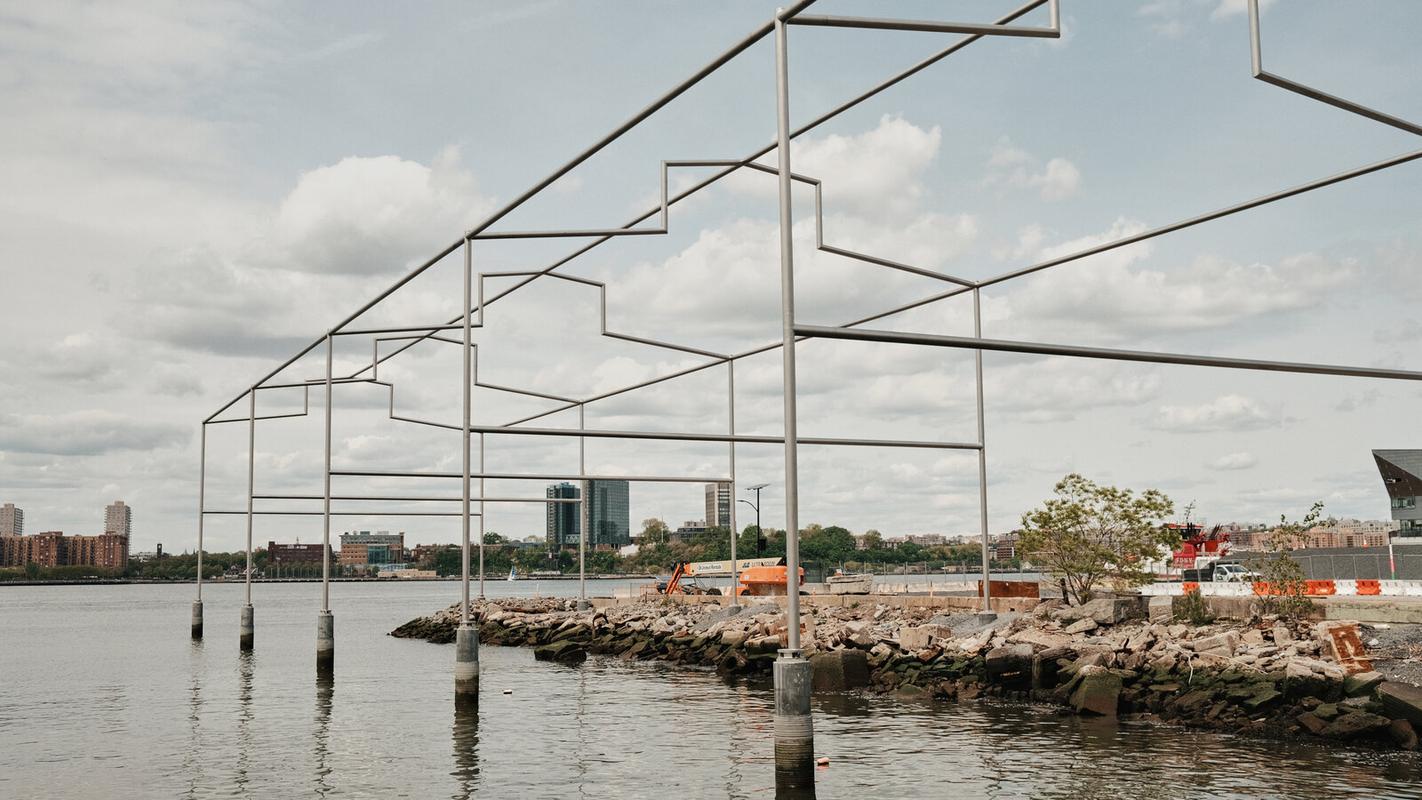 "Day's End" by Hammons extends into the Hudson River, manifesting as an open, skeletal steel structure that precisely follows the architectural footprint of the no-longer-extant Pier 52. It measures a staggering 52 × 325 × 65 feet (approximately 15.9 × 99 × 20 meters), making it one of the largest public art installations in New York City. The work is not only a tribute to Matta-Clark's artistic legacy but also to the broader history of the city's waterfront, encapsulating themes of absence, memory, and the passage of time. The installation offers the public an extraordinary vantage point to engage with the riverfront, providing a space for reflection on the city’s industrial past and its transformation (Whitney Museum of American Art).