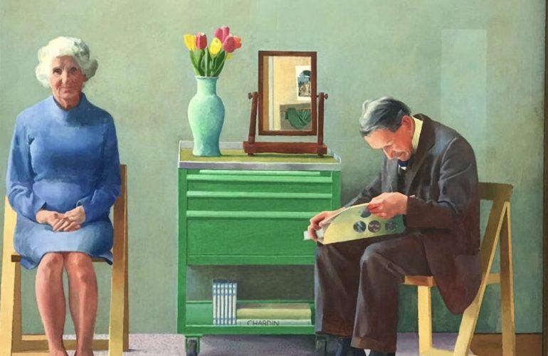 Another significant work is "My Parents" (1977), where Hockney explores the personalities and relationship of his own parents. His father is depicted engrossed in a book, somewhat detached, while his mother sits patiently, her gaze acknowledging the presence of her son, the artist. The inclusion of Piero della Francesca's "Baptism of Christ" in the background and references to the works of Chardin and Marcel Proust's "In Search of Lost Time" enrich the portrait with layers of artistic and literary homage, underscoring the beauty in everyday life and the influence of historical art on Hockney's work.