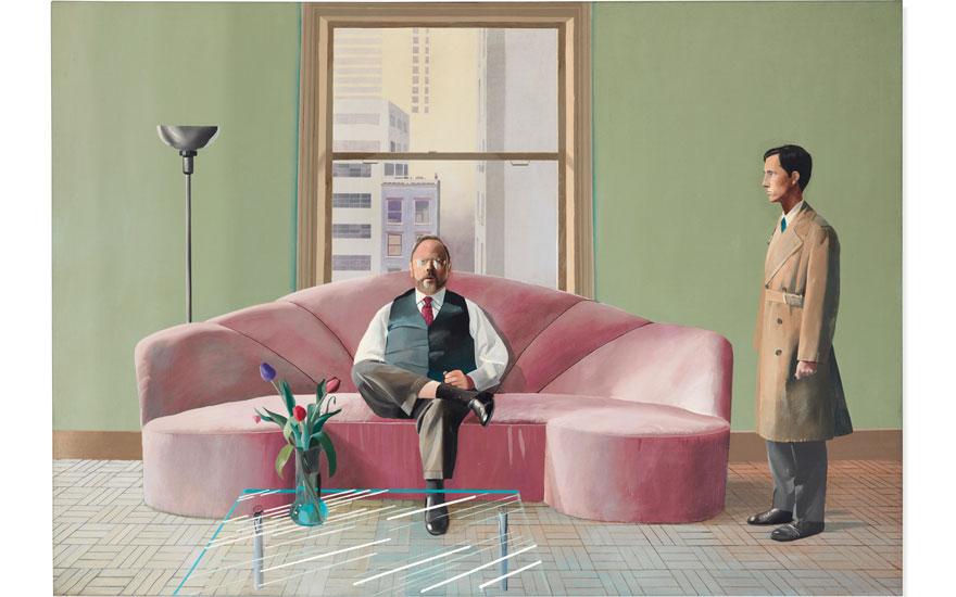 One of the most notable pieces from this period is the portrait of Fred and Marcia Weisman titled "American Collectors" (1968). The Weismans were prominent art collectors, and Hockney's portrayal places art at the center of their existence, with their postures mirroring the sculptures behind them, suggesting they are as much a part of their collection as the artworks themselves. This painting, like many of Hockney's double portraits, delves into the complex interplay between people and their environments, capturing the essence of his subjects with striking visual symbolism.
