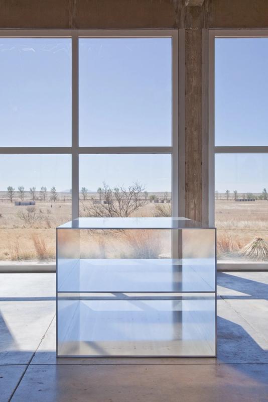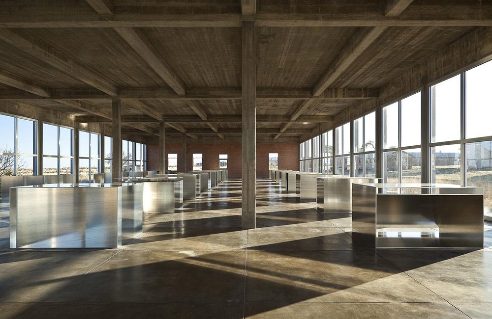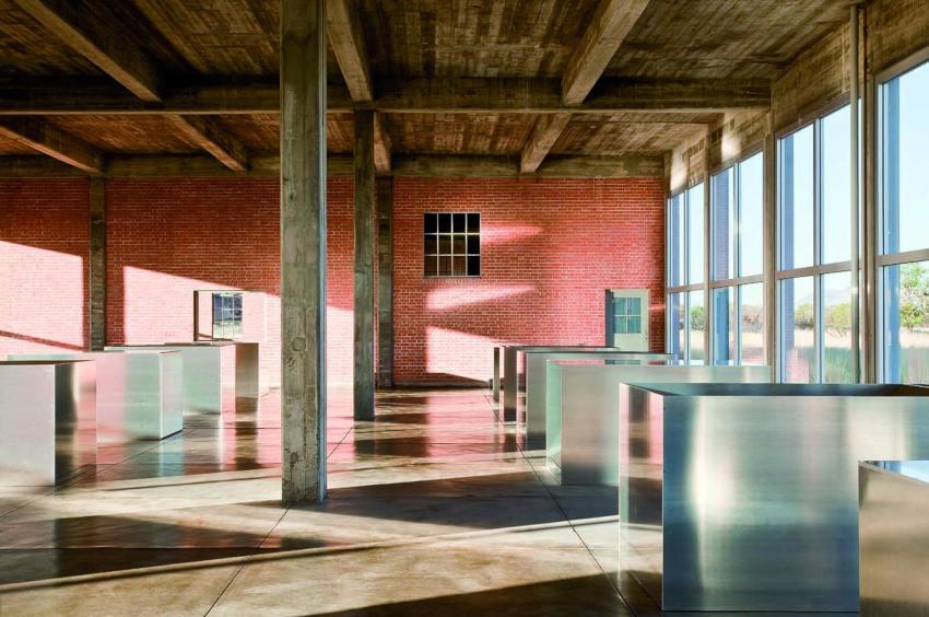 One of the most iconic examples of Judd's work with aluminum is the installation of 100 untitled works in mill aluminum housed at the Chinati Foundation in Marfa, Texas. These works, created between 1982 and 1986, are displayed in two former artillery sheds that Judd himself reconfigured to accommodate these pieces. The renovation included replacing garage doors with vast windows to allow sunlight to interact with the reflective surfaces of the aluminum pieces and adding a vaulted roof to double the buildings' height. This adjustment was not only practical—to stop leaks—but also aesthetic, transforming the sheds into a monumental canvas that complemented the stark simplicity of the aluminum works (Chinati Foundation) (Gagosian).
