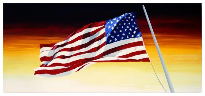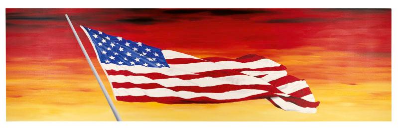 Ed Ruscha's engagement with the American flag in his artwork has evolved significantly over the years, serving as a canvas for his reflections on national identity, political climate, and societal changes. Between 1985 and 1987, Ruscha began incorporating flags into his visual vocabulary, depicting them rippling in the breeze against dramatic backdrops of sunsets or blue skies, often accompanied by subtle warning cues, such as black bars resembling censor strips. This thematic exploration continued with variations such as OUR FLAG (2017), where the flag appears disintegrated into shreds against a near-black sky, symbolizing a nation in tatters (Gagosian).