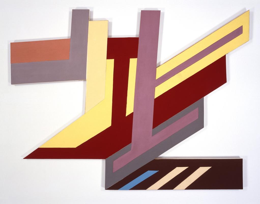 Representative works from this series, like "Kozandgrodek I" (1973), "Rozdol I" (1973), and "Olkienniki II" (1972), showcase Stella's innovative use of mixed media and low relief collage, employing materials like corrugated cardboard, felt, paint, and wood construction. These pieces highlight his exploration into the structural possibilities of painting, moving beyond the flat canvas to create something that occupies a space between painting and sculpture (Lévy Gorvy).