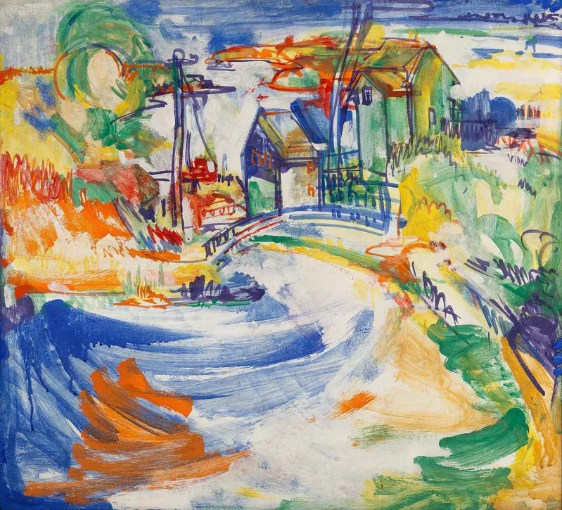In his landscape paintings, Hofmann masterfully weaves together cubist forms with the vibrant color palette of fauvism, creating compositions that pulse with life and movement. One example, "Landscape" from around 1942, displays a geometric skyline of small homes, where patches of color both define and dissolve the boundaries of the townscape beneath. This painting exemplifies Hofmann's interest in what he termed the "push and pull" between elements on the picture plane, a dynamic tension that activates the canvas and invites viewers into a deeper engagement with the work (NCMALearn).