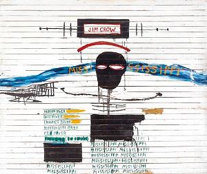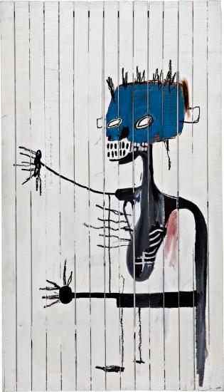 Another significant work that utilizes slatted wood is "Flexible" (1984), which also features a human figure set against a background of slatted wood. This figure, reminiscent of a West African griot, is depicted with arms that appear to be interconnected, symbolizing both physical flexibility and a deeper cultural resilience. The choice of material adds a tactile, three-dimensional quality to the work, enhancing its visual impact and underscoring Basquiat's innovative approach to art-making. The slatted wood serves not only as a support but also as an integral part of the narrative and aesthetic of the piece (MyArtBroker) (MyArtBroker).