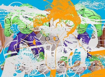 The series, which began in 2004, draws from a wide array of inspirations, including children's art, comic book characters, and historical figures. This diverse source material is unified by Koons' overarching themes of innocence, beauty, sexuality, and happiness. The "Hulk Elvis" artworks are known for their complex layering and the use of Benday dots, which not only ties them to the comic book aesthetics but also nods to the work of Roy Lichtenstein. Koons' work with this series is both a continuation of and a departure from his previous themes, pushing further into the realms of abstraction and figuration while still engaging with the banal and the sublime (Gagosian) (Guggenheim Bilbao).
