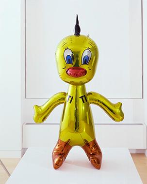 Koons’ sculpture serves as more than just a representation of the cartoon character Titi (also known as Tweety); it symbolizes the joy, the role of consumer objects in society, and the pervasive nature of imagery through tangible items. The bright, glossy finish of the toy-like sculpture contrasts with the rigid translation of its form, transforming the character into a modern-day kouros, evoking the dignity and stateliness of ancient statuary. "Titi" synthesizes several of Koons' recurring themes, making it one of his most iconic works and highlighting his ability to bridge the gap between high art and popular culture (Pinault Collection).