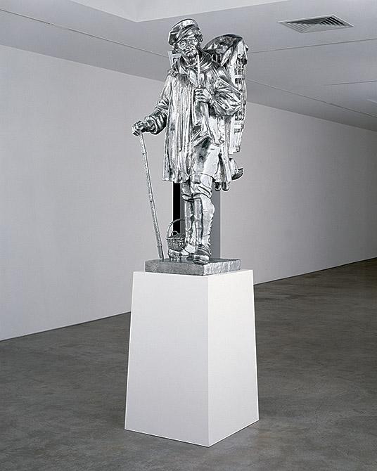 Jeff Koons' "Kiepenkerl" is a remarkable work that delves into the intersection of history, materiality, and modern consumer culture. Created for the 1987 Sculpture Projects in Münster, Germany, this polished stainless steel sculpture replicates a historic statue representing a Kiepenkerl - a traveling merchant from the region. The original Kiepenkerl statue, made by August Schmiemann in 1896, was destroyed in World War II and later recreated in bronze by Albert Mazzotti Jr. in 1953. Koons' version, however, stands as a gleaming modern interpretation, rendered in the "material of the masses" to give it a "false front of luxury," a significant departure from the original's material and historical connotations (Guggenheim Bilbao) (Wikipedia).