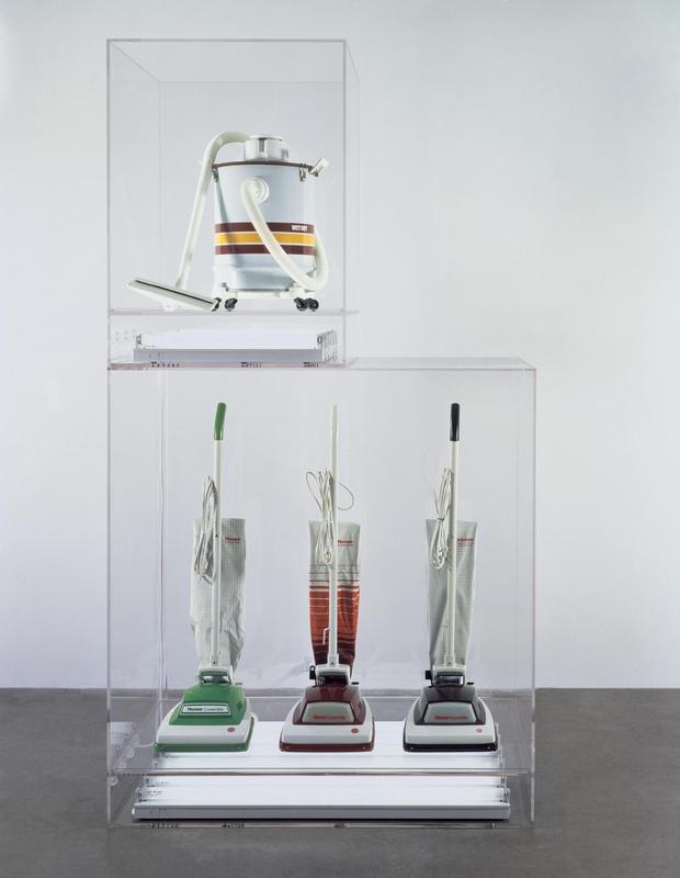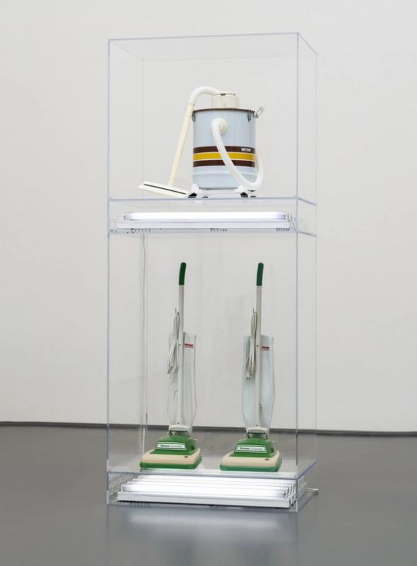 Jeff Koons' "The New" series, initiated in 1979, showcases his early exploration of consumerism and the commercial aesthetics that define much of his later work. This series is particularly known for its presentation of new vacuum cleaners and floor polishers, encased in Plexiglas and illuminated by fluorescent lights, mimicking the display methods of commercial products in retail environments. Through "The New," Koons comments on the societal obsession with newness and the pristine, questioning the value and lifecycle of consumer goods (Artland Magazine).