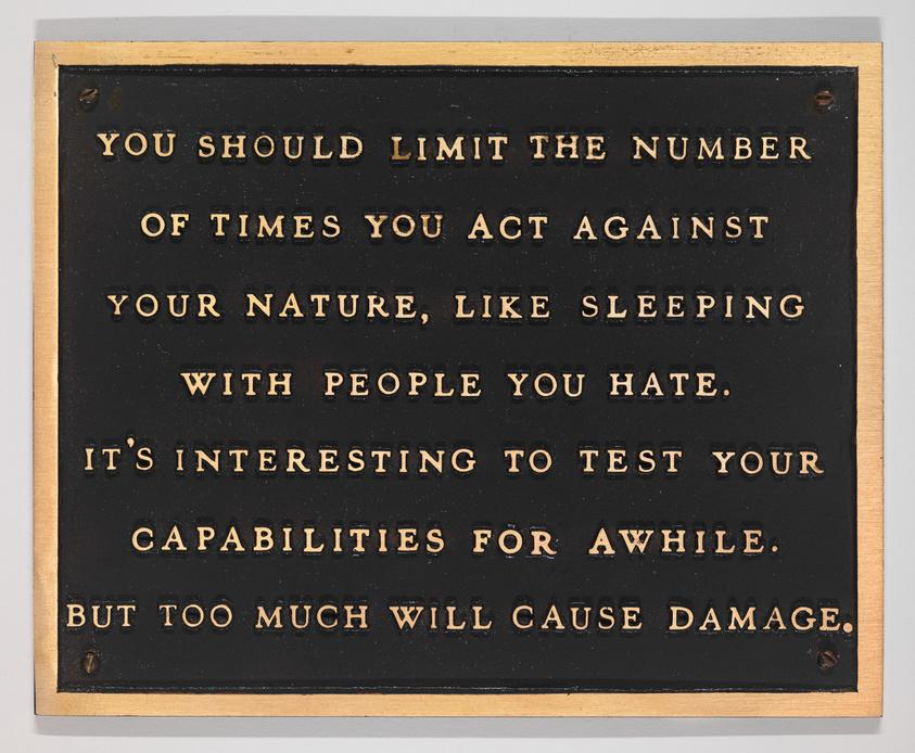 Jenny Holzer's "Living Series" (1980-1982) represents a pivotal moment in her career, where her exploration of language as a medium for art deepened significantly. The series consists of texts that offer reflections on human existence, interaction, and the complexities of life. These works were presented on bronze plaques, a material choice that imbues the texts with an air of authority and permanence, echoing Holzer's interest in the power dynamics of communication and the authoritative voice (Art and Culture).