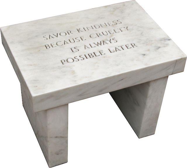 Holzer's benches are not just artistic objects; they are functional pieces that invite viewers to sit, ponder, and engage with the texts engraved upon them. By placing these works in public spaces, Holzer extends her exploration of language and communication, making her provocative insights a part of the physical and communal landscape. These benches exemplify Holzer's commitment to embedding complex ideas within the fabric of everyday life, challenging passersby to consider deeper truths and contradictions inherent in the human condition.