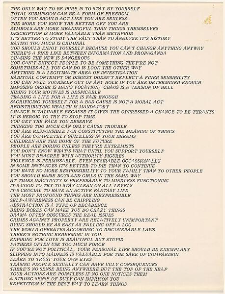 The content of the Truisms covers a broad spectrum of ideas, touching on themes such as power dynamics, social norms, and the complexities of human behavior. Presented in alphabetical order, these statements are designed to be both self-contained and part of a coherent whole, engaging viewers through their brevity and the hypnotic rhythm of their presentation on electronic displays. Holzer's aim was to capture the fleeting attention of passersby in public spaces, offering them brief yet complete messages that could be instantly absorbed or pondered upon more deeply if the viewer chose to engage longer (Tate Gallery).