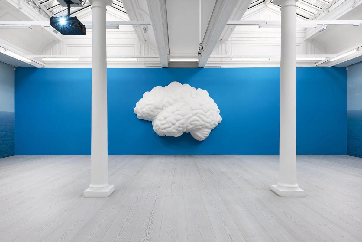 John Baldessari's Brain/Cloud (Two Views): with Palm Tree and Seascape is a monumental sculptural installation that intricately blends the realms of painting, sculpture, and video art. Showcased at Marian Goodman Gallery in London from November 8, 2018, to January 12, 2019, this work was the first presentation of the piece since Baldessari's major 2010 traveling retrospective Pure Beauty, which had premiered at Tate Modern in 2009. The installation features an enormous wall-mounted sculpture of a cerebral cortex crafted from painted polyurethane, accompanied by two inkjet prints of a seascape—one foregrounded by a palm tree—and a time-delayed video that projects viewers looking at the sculpture, creating a reflective loop where the audience becomes part of the art itself (Marian Goodman) (GalleriesNow.net).