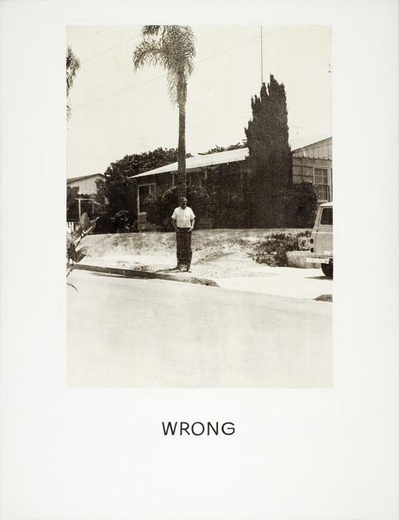 John Baldessari's "Wrong" series (1966-1968) is a seminal work in the conceptual art movement, exemplifying his innovative approach to art-making. In this series, Baldessari challenged traditional norms and expectations around the composition of photographs. The most well-known piece from the series, also titled "Wrong," features a photograph of the artist standing in front of a palm tree, intentionally positioned so that the tree appears to be growing out of his head. This composition directly violates a "rule" from an amateur photography book about avoiding such misalignments that would result in a tree appearing to grow out of a person's head. The irony and blatant judgment of the photograph, underscored by the word "wrong" placed below the image, playfully critique the rigidity of artistic rules and standards (www.wikiart.org).