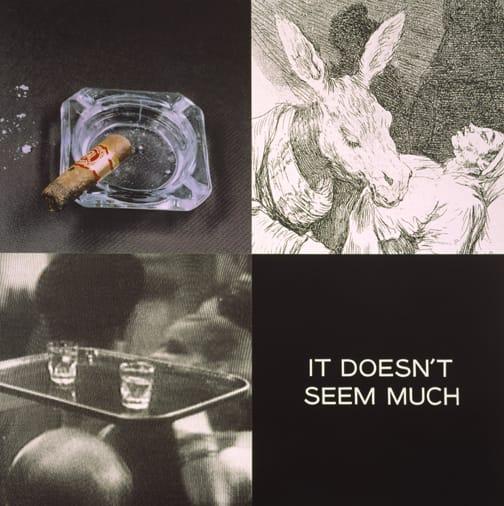 Through the Tetrad series, Baldessari continues his investigation into the relationship between language and imagery, a hallmark of his artistic practice. The inclusion of text from Pessoa alongside the visual elements drawn from various sources underscores Baldessari's interest in the fluid interpretations of meaning and the viewer's active role in constructing narrative or conceptual bridges between disparate elements (Marian Goodman Gallery).