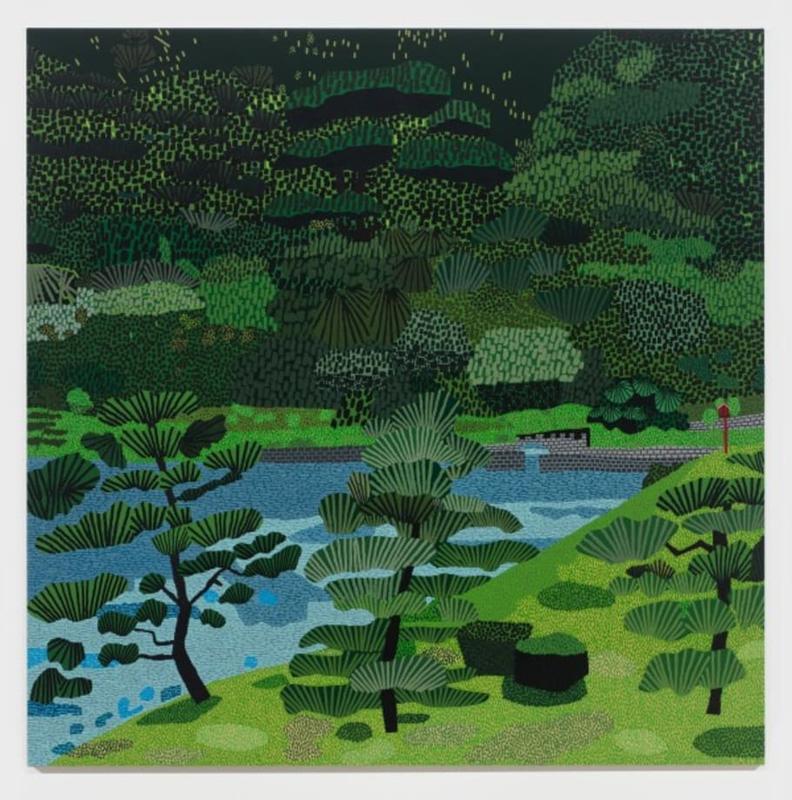 Jonas Wood's Japanese Garden series, initiated in 2017, stands out as a vivid exploration of nature and architectural exteriors through the artist's distinctive lens. The series exemplifies Wood's deep interest in bringing the outdoors into his artistic realm, particularly focusing on the orderly and meticulously curated spaces of traditional Japanese gardens. These works are characterized by their layered composition, combining a patchwork of flattened forms with intricate brushwork, predominantly featuring lush greens and blues that together create a serene and contemplative space on canvas.