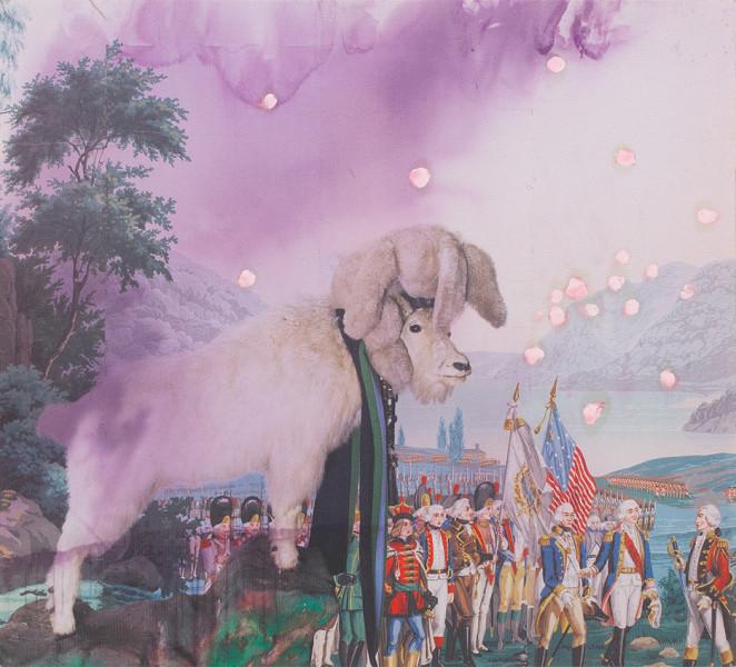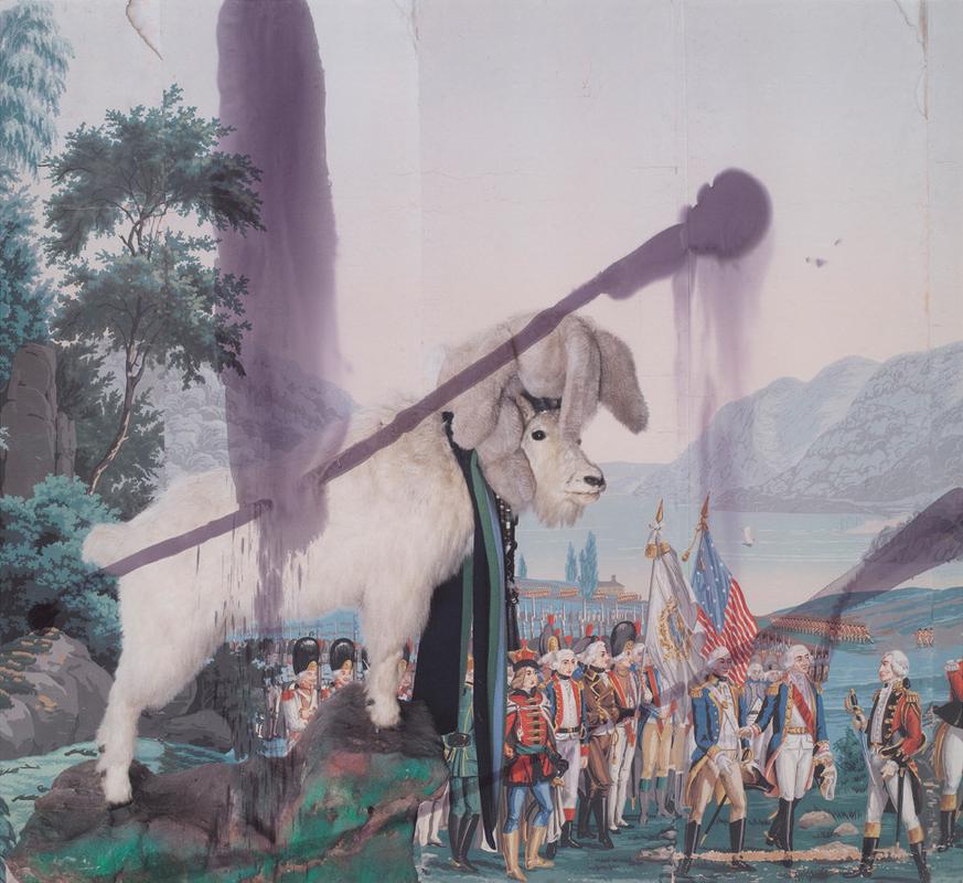 The "Goat Paintings" were part of Schnabel's broader exploration of symbolism and material experimentation, evident in his solo exhibition "Julian Schnabel: Symbols of Actual Life" at the Legion of Honor in San Francisco in 2018. This exhibition highlighted Schnabel's enduring interest in pushing the limits of painting through the incorporation of varied textures and materials, from Mexican sack linen to digital reproductions, and including motifs like stuffed goats and historical wallpapers. These elements together create a visual and thematic richness, bridging the past with the present in Schnabel's unique visual language (FAMSF).