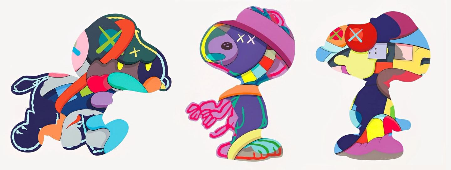 "No One’s Home," "Stay Steady," and "The Things That Comfort" are shaped canvases that feature Snoopy silhouettes with KAWSBOB imagery, vibrant colors, and the iconic "X" eyes that often replace the characters' eyes. These paintings continue KAWS's exploration of themes such as identity, consumer culture, and the emotional depth of seemingly simple characters. By reimagining familiar figures from pop culture, KAWS challenges viewers to reconsider their associations with these icons and the broader cultural narratives they represent.