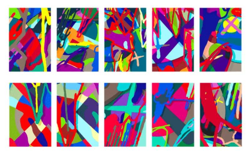 The "Tension" series consists of ten paintings measuring 35 x 23 inches that feature abstract compositions with slightly more recent abstract KAWSBOB imagery and motifs. The series is also a set of ten screenprints with an edition size of 100.