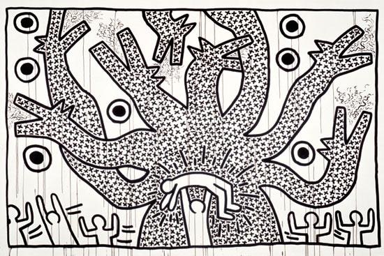 Haring's early explorations in Sumi ink can also be traced back to his formative years, with some of his large-scale ink drawings showcased in his early exhibitions. These works highlight his mastery over line and his ability to imbue simple forms with vibrancy and motion, often incorporating his signature elements like dripping paint, which add a raw, energetic quality to the pieces (artcritical).