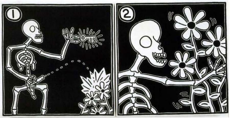 Keith Haring's "Untitled (For James Ensor) 2" from 1989, as part of a diptych, complements its counterpart by depicting the transformative power of death and renewal. The first panel starkly presents a skeleton in the act of ejaculating onto a flowerbed, a symbol of life emerging from death. In the second panel, this act results in flowers blooming towards the sun, a metaphor for rebirth and the cycle of life, with the skeleton smiling upon the scene. This work, like much of Haring's later art, delves into themes of mortality, sexuality, and innocence, reflecting his own experiences and the broader societal context of the AIDS epidemic, to which Haring himself succumbed in 1990.