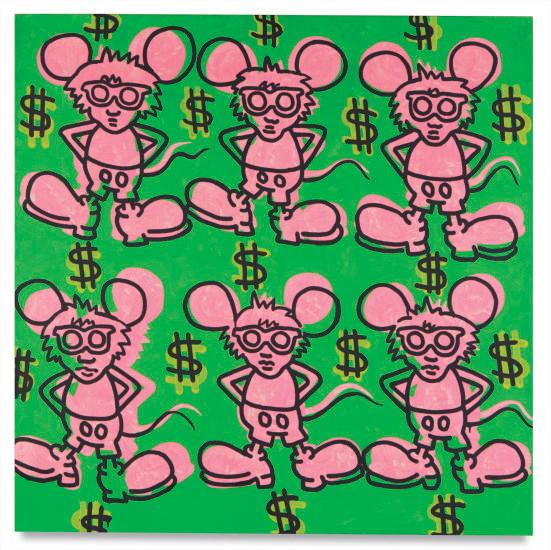 "Andy Mouse" is celebrated for its bold lines and graphic clarity, characteristic of Haring's graffiti-inspired style. The use of vivid colors enhances its visual impact, echoing the Pop Art tradition of employing commercial aesthetics to grab attention and provoke thought. The inclusion of pop culture references, such as the merging of Mickey Mouse and Andy Warhol, serves multiple purposes, paying homage to Warhol, critiquing the art market, and inviting a wide audience to connect with the artwork on various levels.