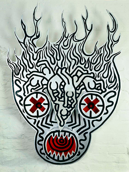 In 1987, Keith Haring created a captivating series of eight masks that are a testament to his diverse artistic influences and his exploration into sculpture, an area he pursued earnestly starting in 1985. These works, including the Untitled (Burning Skull), are characterized by Haring's signature vibrant enamel on aluminum, showcasing his iconic rhythmic, black contoured forms. The series stands out for its blend of exoticism, drawing from Haring's interest in folk and "outsider" art forms, as well as the early modernism of Western masters and influences from African and Mesoamerican cultures. This eclectic mix allowed Haring to forge his unique iconography, marrying his social commentary with a broad array of cultural expressions (Lévy Gorvy).