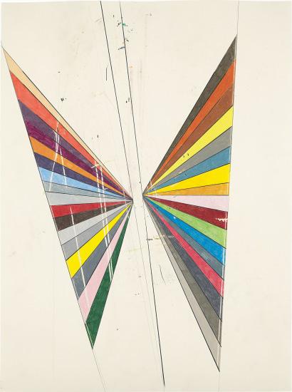 The Butterfly series marks a significant departure from traditional perspective, employing dual and multi-point perspectives to forge dynamic geometric patterns that seem to recede into deep vanishing points. This methodological approach not only challenges the viewer's perceptual boundaries but also invokes a sense of depth and motion, a testament to Grotjahn's skillful manipulation of visual space. His use of bold and often contrasting colors further amplifies the visual impact of these works, creating a vibrant, yet nuanced, chromatic palette.