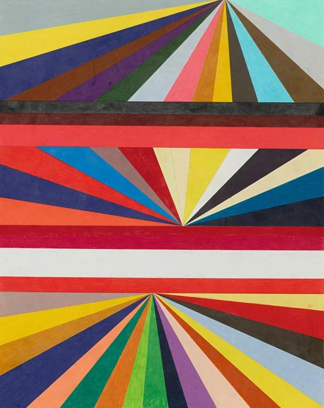 In these works, Grotjahn divides the canvas into vertically stacked segments, each containing radiating lines that converge at different vanishing points. This strategic organization of space creates a hypnotic and complex composition, inviting viewers to navigate through the layers of color and form. The series exemplifies Grotjahn's rigorous process, where he first outlines the geometric framework in pencil before filling in the contours with rich, opaque color, working systematically from left to right. This precise technique results in a dynamic, energetic visual field that simultaneously captivates and disorients, embodying Grotjahn's interest in the interplay between order and chaos, structure and spontaneity.