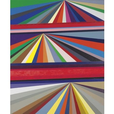 "Untitled (Three-Tiered Perspective)," a notable piece from this series executed in 1999, exemplifies Grotjahn's innovative approach to abstract painting. The work, characterized by its immersive scale and meticulous detail, serves as a testament to Grotjahn's analytical and labor-intensive painting technique, which is both celebrated for its technical prowess and the emotive power of its creation. The piece's polychromatic orthogonals, which recede into differing vanishing points across the three sections, produce a mesmerizing effect, reflecting Grotjahn's fascination with the potential of serial abstraction to expand the visual and conceptual boundaries of painting (Sothebys.com).