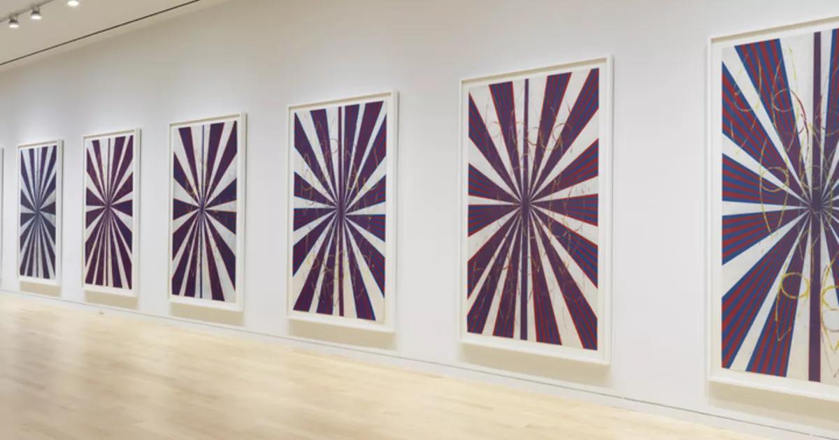 The series utilizes Captain America's iconic red, white, and blue color scheme to create vibrant, dynamic compositions. These pieces feature Grotjahn's signature centrifugal radiant motif, which synthesizes the character of Captain America into pure, vibrating lines of force. The geometry and process resonate with each other through razor-sharp perspectival rays and random marks, reflecting Grotjahn's meticulous working method. Acid-yellow calligraphy surfaces intermittently, adding an abstract expressionist layer to the pieces (Gagosian).