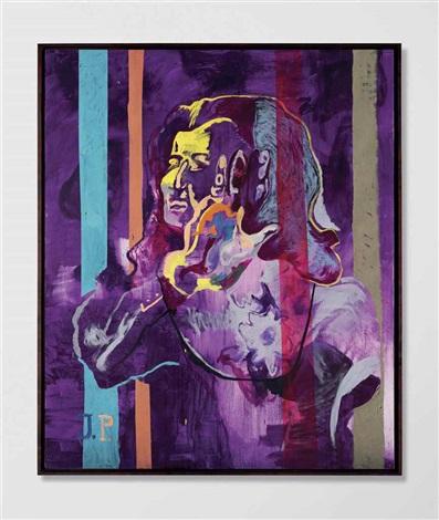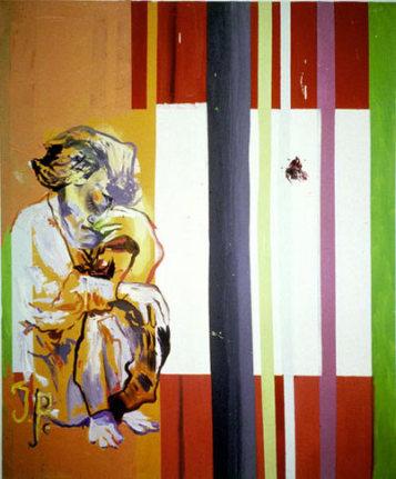 Martin Kippenberger's Jacqueline: The Paintings Pablo Couldn’t Paint Anymore is a compelling series completed in 1996, a year before the German artist's death at 44. This series comprises eight paintings and one large sculpture, Modell Winnetou, as a poignant homage to Pablo Picasso and his widow, Jacqueline Picasso. The paintings, based on photographs taken in Picasso's studio after his death, depict Jacqueline during a period of deep mourning, surrounded by the couple's belongings and Picasso's artworks. Kippenberger's approach to these portraits is notably abstract, blending sketchy renderings of Jacqueline with intense color backgrounds, stripes, and elements that reference modernist abstract painting (Metro Pictures).