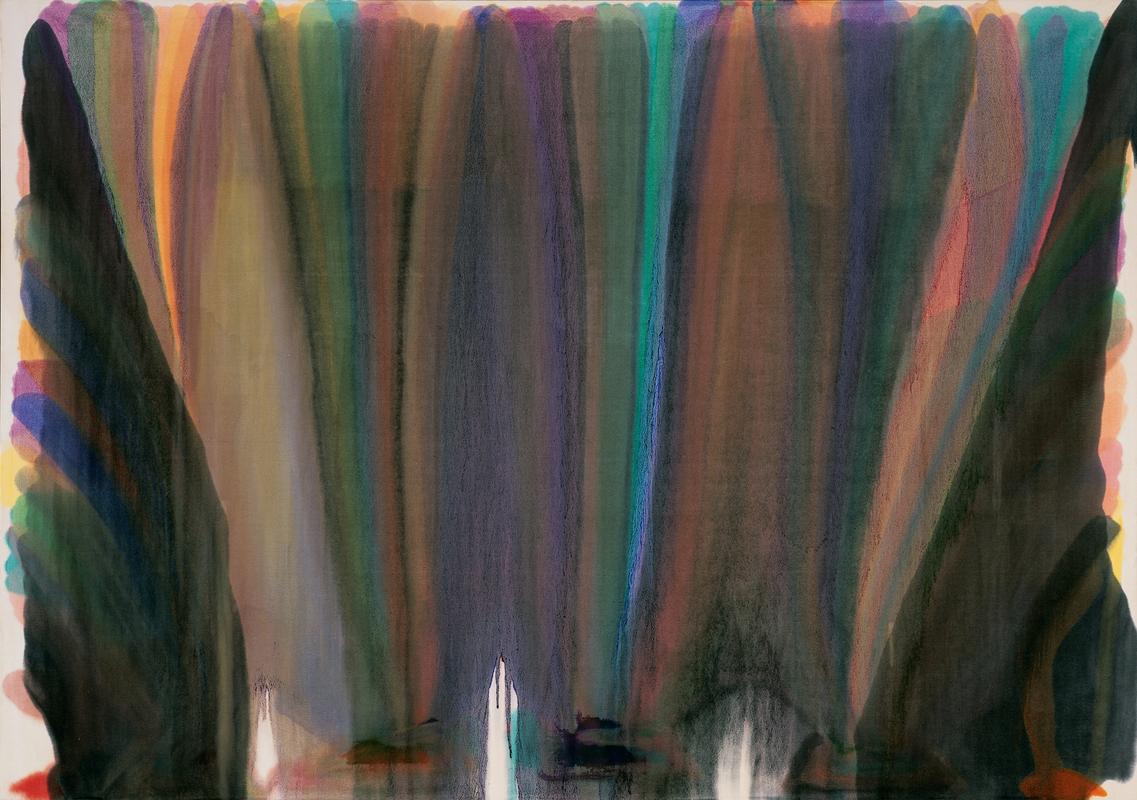 The Veils series marked a departure from Louis' earlier work, embodying a shift towards abstract expressionism with a distinct focus on color field painting. Utilizing a technique where thinned paint was poured and then tilted on unprimed canvas, Louis achieved layers of translucent color that seemed to float within the canvas space, creating a sense of depth and luminosity. This method allowed colors to blend and bleed into one another without a discernible start or end point, emphasizing the painting's surface and the pure experience of color. The series was characterized by its large scale and the physical process involved in its creation, which was both a response to and a departure from the dominant abstract expressionist modes of the time, particularly the action painting represented by artists like Jackson Pollock.