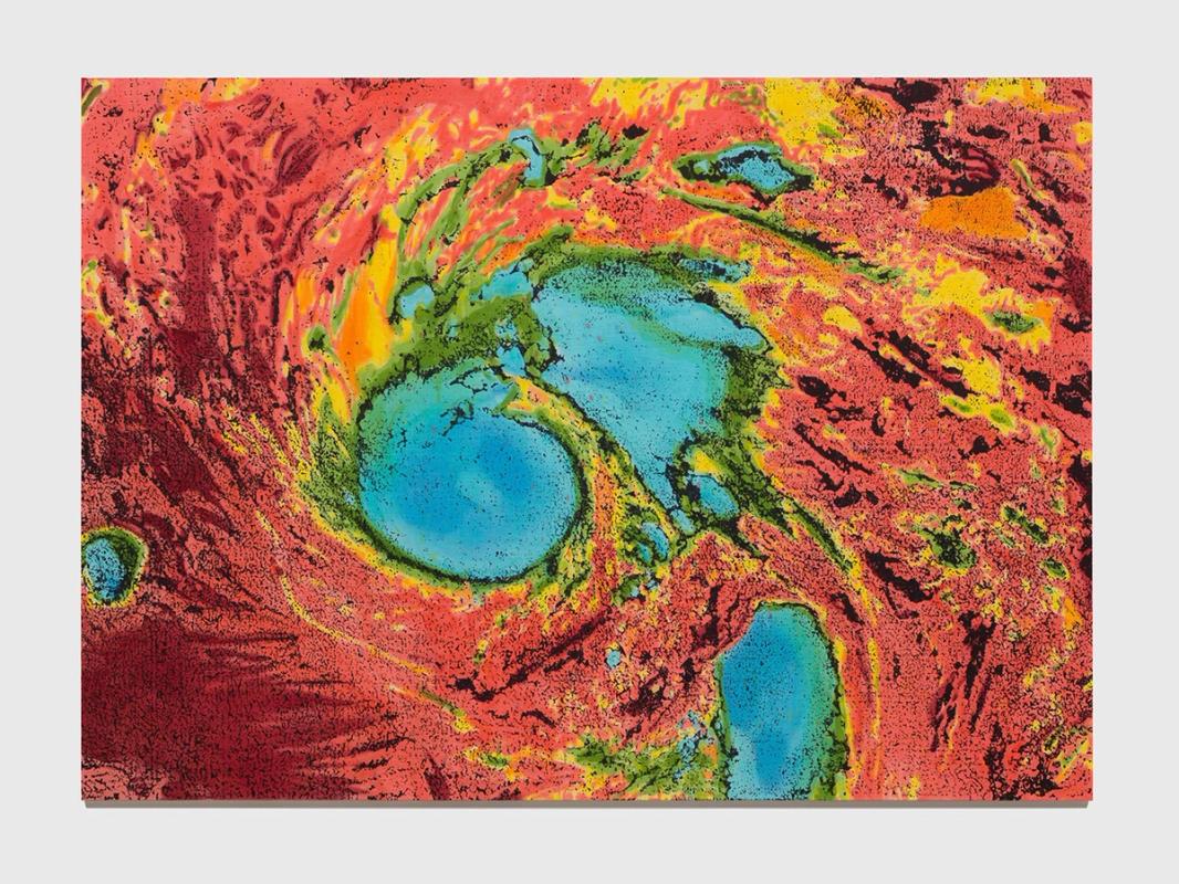 Nate Lowman's "Hurricane" paintings are a compelling series that explore the intersection of natural disasters and media representation. These works transform digitally rendered images of hurricanes into vibrant, large-scale paintings. The series reflects Lowman's ongoing interest in the physicality of his medium and the chaotic subject matter it portrays.