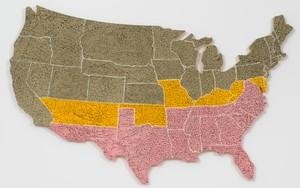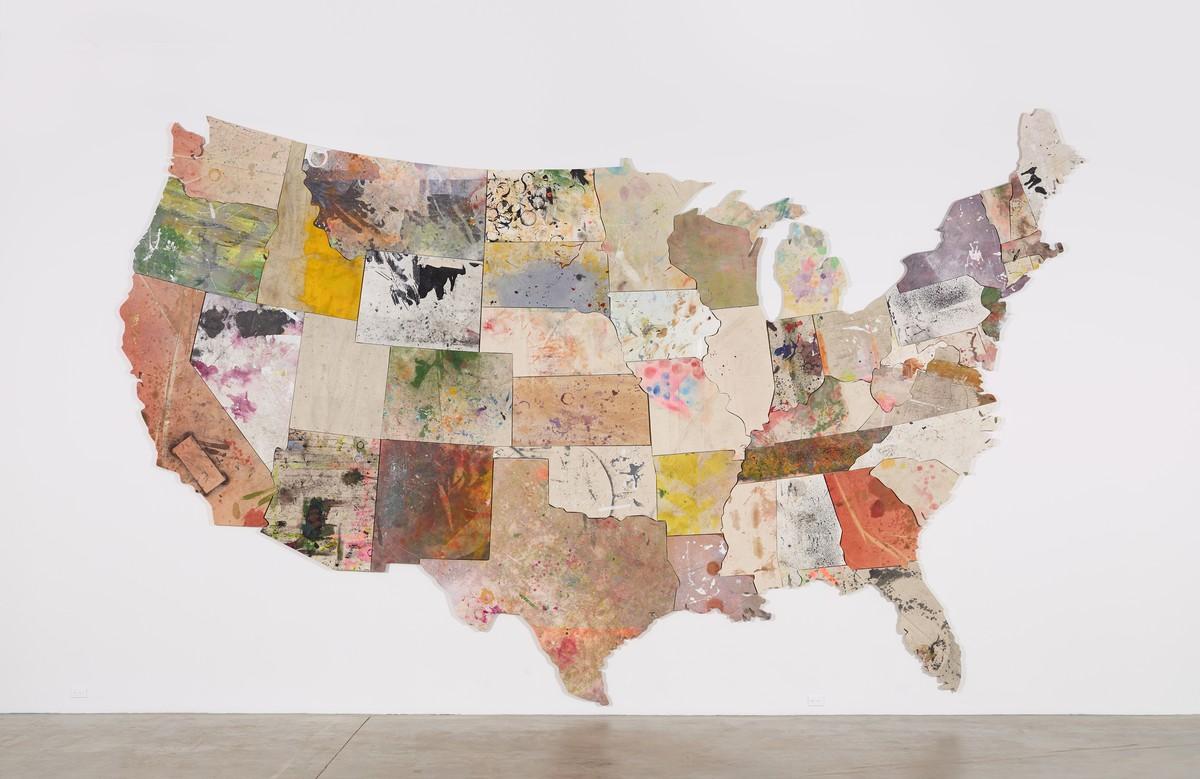 Nate Lowman's "Map" paintings are a distinctive series that began in 2013, showcasing his ability to blend abstraction, political commentary, and appropriation art. These works utilize fragments of studio drop-cloth cut into the shapes of individual U.S. states, which are then sewn together and stretched over canvas supports. This process creates a fragmented yet cohesive map of the United States, highlighting the arbitrary nature of borders and the fluidity of national identity (Gagosian) (Artmap).