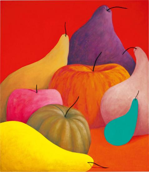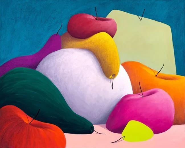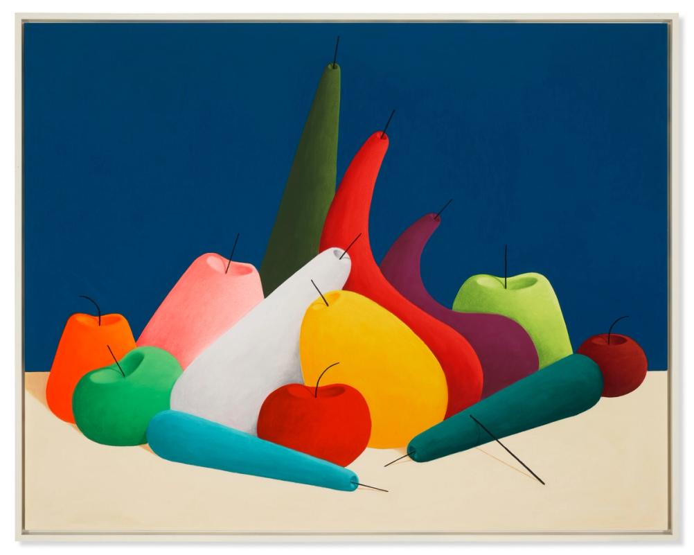 Party's still lifes often feature everyday objects such as fruits, vases, and flowers, depicted in surreal and abstract forms. These objects are meticulously arranged and shaded to create a sense of depth and volume, making them appear almost three-dimensional. His compositions are known for their bold color palettes and clean, simplified shapes, which draw comparisons to the works of artists like Giorgio Morandi and Paul Cézanne. However, Party infuses his still lifes with a whimsical and otherworldly quality, reminiscent of Surrealism, that makes his work stand out in the contemporary art scene (Christie's) (Christie's) (Hauser & Wirth).