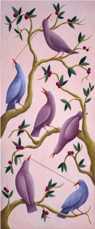 Nicolas Party's paintings of birds are a testament to his ability to combine traditional artistic techniques with modern themes and vibrant, surreal aesthetics. His use of soft pastels and his symbolic, often narrative-driven compositions make his bird paintings a compelling and integral part of his broader body of work.