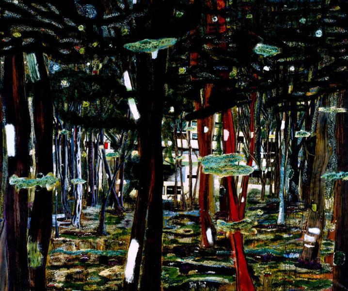 The Concrete Cabins series is inspired by Doig's visit to Le Corbusier’s Unité d’Habitation in Briey-en-Forêt, France. This seminal cycle of paintings, part of Doig’s Turner Prize exhibition in 1994, depicts an idealized vision of modernist architecture veiled by nature. These works juxtapose the utopian ambitions of modernist architecture against the encroaching, sometimes reclaiming forces of the natural environment, blurring the lines between the built environment and the wilderness. Through his manipulation of paint, Doig creates scenes that are both specific in their architectural references and universal in their evocation of a dream-like state, where the boundaries of man-made structures and nature dissolve (Christie's).