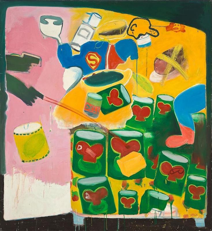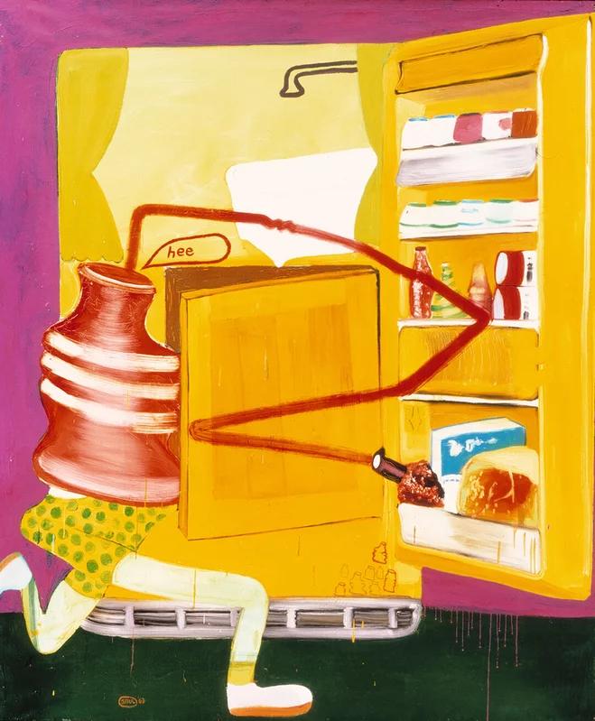 Peter Saul's Ice Box series, produced between 1960 and 1963, represents a pivotal moment in his artistic journey, blending Abstract Expressionism, Surrealism, and anticipations of Pop Art into engaging, thought-provoking compositions. These works are notable for their intricate detailing, vibrant colors, and the incorporation of everyday objects, transforming the mundane subject of a refrigerator into a complex, action-packed scene. This series, comprising just ten works, showcases Saul's unique ability to merge various artistic influences, including the psychological intensity reminiscent of Francis Bacon and the social commentary akin to Andy Warhol, yet distinct in its execution and thematic exploration (Phillips).